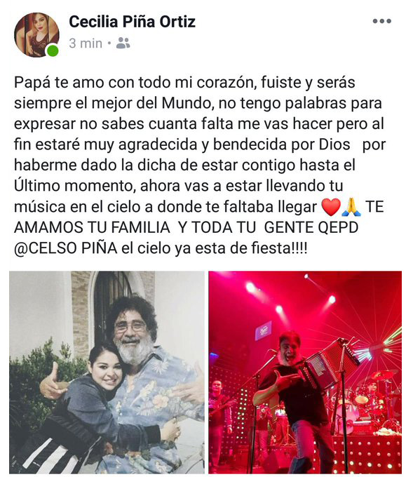 De acuerdo a un comunicado emitido por su disquera el Maestro Celso Piña falleció a las 12:38 pm a causa de un infarto. “Nos quedamos con un intenso vacío, pero nos deja su gran legado para siempre. Agradecemos respetar la privacidad de la familia”.