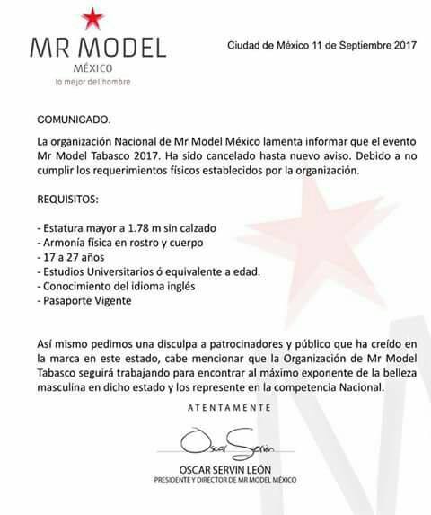 Tremenda controversia en redes causó una agencia de modelaje de Tabasco, luego de que anunciara la cancelación de su concurso ‘Mr Model Tabasco 2017’, esto porque sus participantes no cumplían con los requisitos físicos.