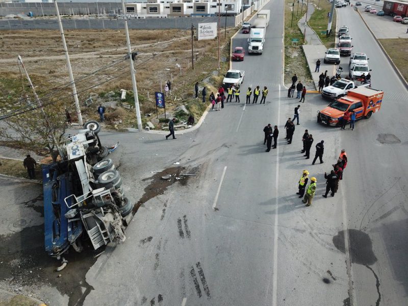 Un camión de pasajeros circulaba a gran velocidad y quitó derecho de paso a un tráiler, provocando el encontronazo que dejó volcado al pesado vehículo.