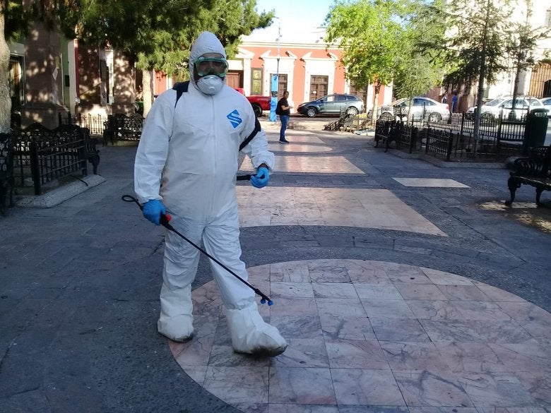 En las imágenes se puede ver a hombres enfundados en sus trajes tipo NBQ, que rociaban desinfectante en las calles del primer cuadro de la ciudad de Saltillo.