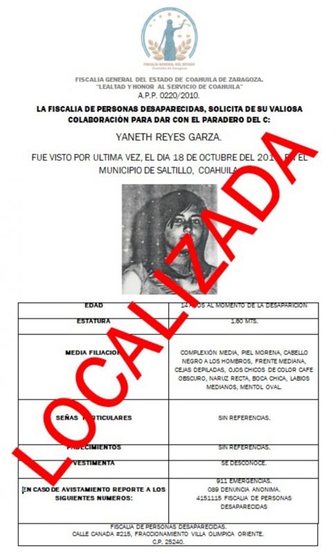 Saltillo, Coahuila.- La Fiscalía Especializada de Personas Desaparecidas de Coahuila, informó este lunes, haber localizado a la saltillense, Yaneth Reyes Garza, quien fue reportada como desaparecida desde el 18 de octubre del 2010.