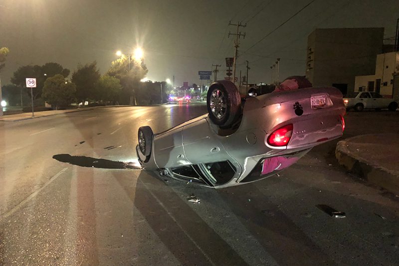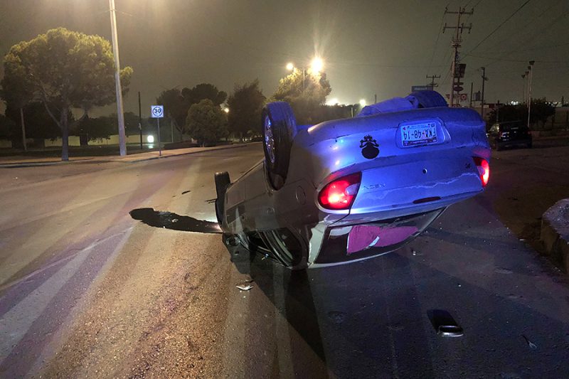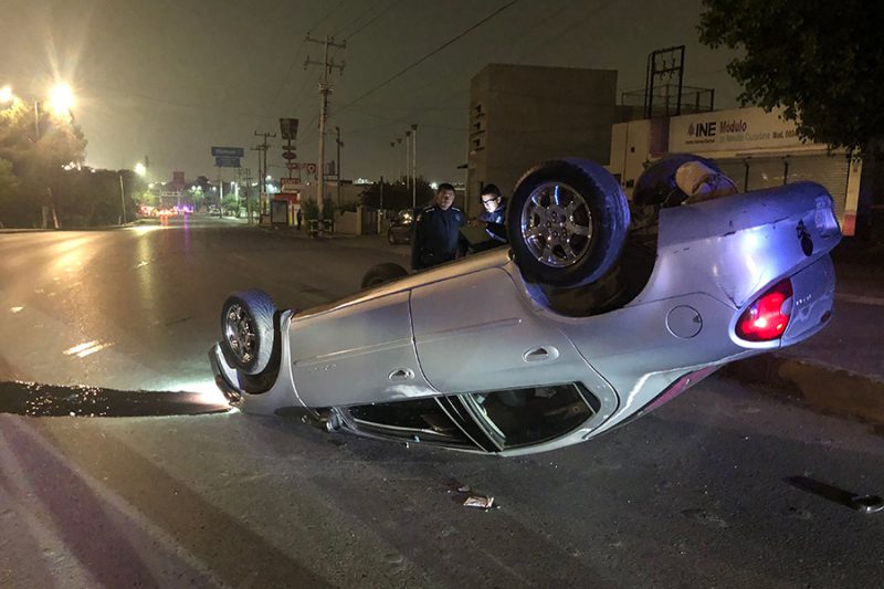 Saltillo, Coahuila.- Con los neumáticos hacia arriba terminó un vehículo luego de que su conductor le intentó sacar la vuelta al antialcohol, pero al manejar a exceso de velocidad chocó contra la cuneta lo que lo hizo volcar.