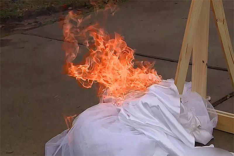 Sin embargo, faltaba el punto cúlmine, ya que ante la mirada de sus vecinos y familiares, Brianna puso su vestido de novia en una especia de trípode y terminó por prenderle fuego ante los gritos del “público”.