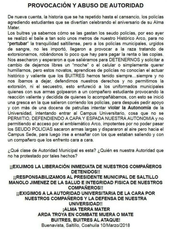 Saltillo, Coahuila.- En caos y zafarrancho terminó la celebración de los 95 años de la Universidad Agraria Antonio Narro, en donde decenas de estudiantes protagonizaron una salvaje riña en contra de elementos policiacos quienes activaron el Código Rojo en la ciudad.