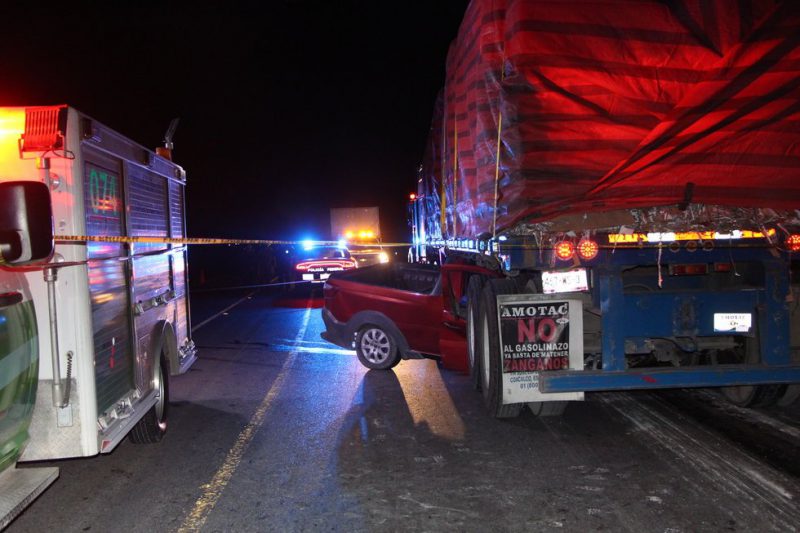 Al llegar al entronque con el tramo de cuota un tráiler que no hizo el alto obligatorio en la intersección, les quitó el derecho de paso causando que chocaran con su camioneta Dodge Ram en contra de la caja del tráiler, quedando prensados y sin vida.