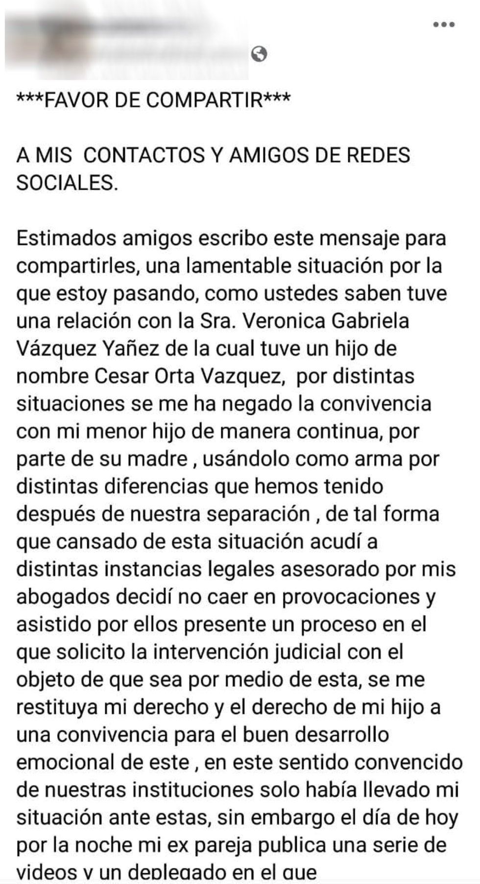 Apenas dos horas más tarde el padre del niño responde a las acusaciones de su ex pareja por esta misma vía, Facebook, asegurando que Gabriela no le permite estar cerca de su hijo, por lo que se vio orillado a interponer una denuncia ante la Procuraduría de los Niños, Niñas y la Familia (Pronnif) para que le sean restituidos sus derechos y obligaciones como padre.
