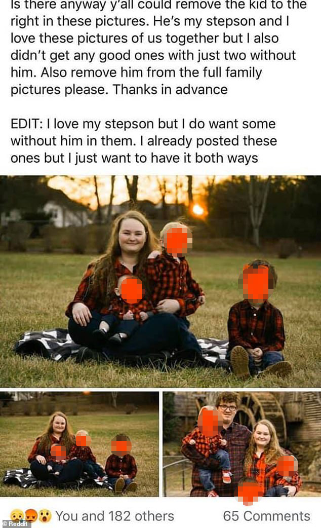 Una mujer estadounidense ha sido tachada de “repugnante y deplorable” después de pedir a los usuarios de las redes sociales que editen a su hijastro de las fotos familiares.