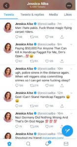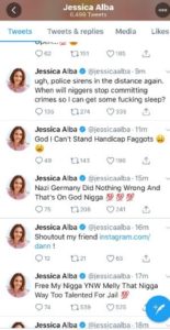 El hacker publicó una serie de tuits desde el perfil de Alba, alertando a los fanáticos de que su cuenta había sido pirateada. El primer tweet, que claramente no fue publicado por Alba, decía: “La Alemania nazi no hizo nada malo y eso está en Dios N ****”