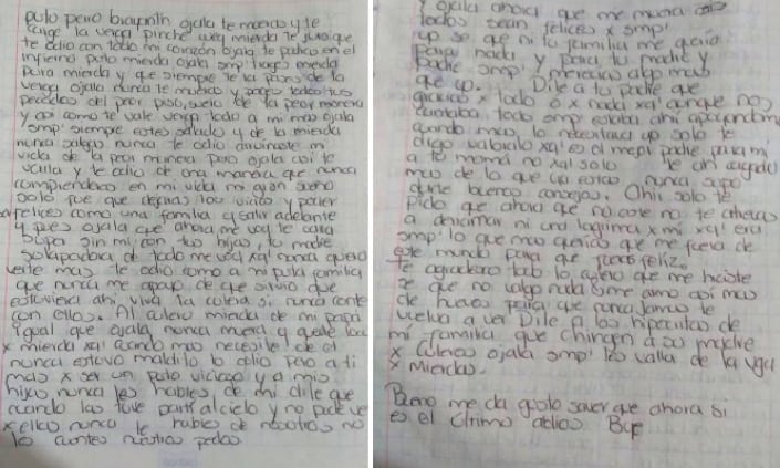 … Me voy porque nunca quiero verte más te odio como a mi put**familia que nunca me apoyo de que sirvió que estuviera ahí viva la cule**a si nunca conté con ellos. Al cule**o mie**da de mi papá igual ojalá nunca muera y quede loco el maldito, lo odio, de que sirvió que estuviera ahí si nunca me apoyo cuando lo necesite, pero a ti más por ser un pu**o vicioso… a mis hijas nunca les hables de mí, diles que cuando las tuve partí al cielo y no las pude ver por eso nunca les hables de nosotros, no cuentes nuestros pedos”.
