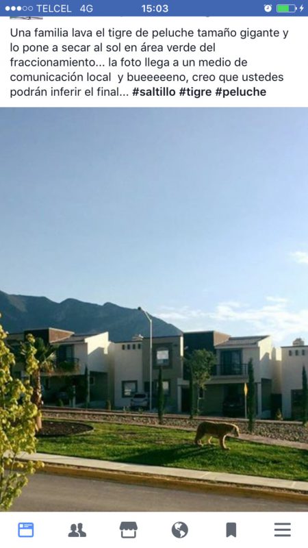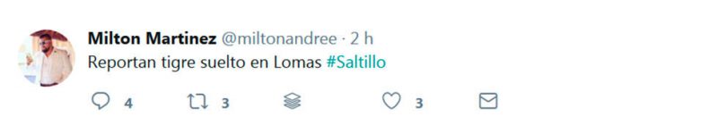 “Reportan tigre suelto en Lomas #Saltillo”, publicó el comunicador en sus cuentas de Twitter y Facebook.