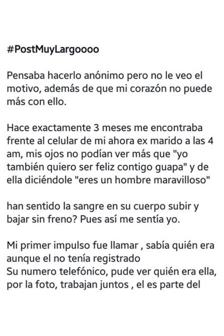 “Hace exactamente 3 meses me encontraba frente al celular de mi ahora ex marido a las 4am, mis ojos no podían ver más que “yo también quiero ser feliz contigo guapa” y de ella diciéndole “eres un hombre maravilloso”, explicaban las primeras líneas del posteo.
