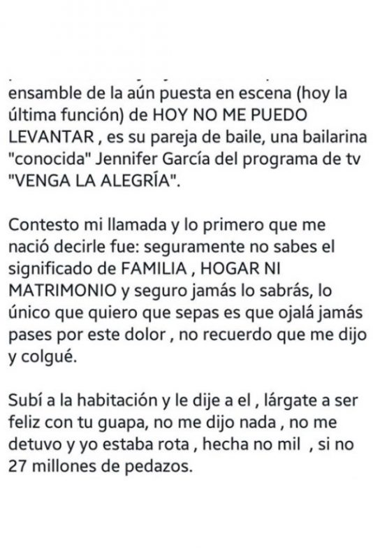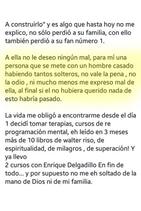 “Hoy estoy en proceso, un proceso que se me ha hecho eterno y no han pasado ni 6 meses, pero quiero soltarlo, quiero que el dolor que de pronto me llega, se vaya… A ella no le deseo ningún mal, para mí una persona que se mete con un hombre casado habiendo tantos solteros, no vale la pena, no la odio, ni mucho menos me expreso mal de ella, al final si el no hubiera querido nada de esto habría pasado”, mencionó en su carta.