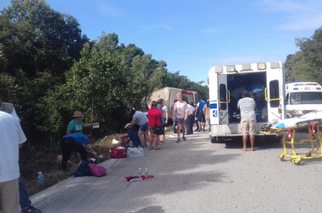 MAHAHUAL.- Un autobús turístico con capacidad para 40 personas volcó alrededor de las 10:30 de la mañana en la carretera Cafetal- Mahahual, en Quintana Roo con un saldo de al menos 12 personas muertas y 18 lesionados, informó la Secretaría de Seguridad Pública de la entidad.